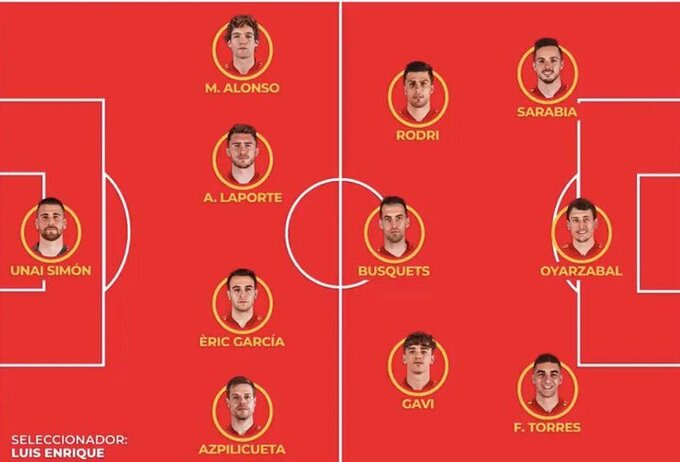 Испания: Унаи Симон, Аспиликуэта, Ляпорт, Гарсия, Алонсо, Гави, Бускетс, Родри, Ферран Торрес, Сарабия, Ойярсабаль.