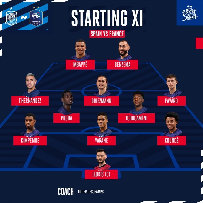 Франция: Льорис, Кюнде, Варан, Кимпембе, Павар, Погба, Тшуамени, Тео Эрнандес, Гризманн, Бензема, Мбаппе.