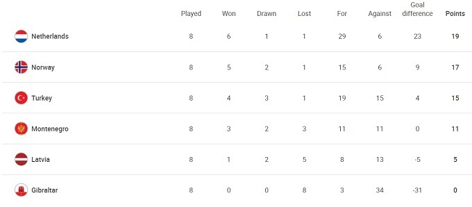Группа G. Нидерланды унизили Гибралтар, Турция вырвала победу над Латвией
