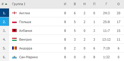 В группе I Англия сыграла вничью с Венгрией (1:1) и имеет три очка перевеса над Польшей, которая в важном матче обыграла Албанию (1:0).