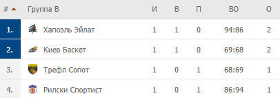 Напомним, в Кубке Европы ФИБА на первом групповом этапе сформированы 8 групп по 4 команды. По два лучших коллектива из каждого квартета выйдут во второй групповой турнир. «Киев-Баскет» в результате жеребьевки угодил в группу В, где его соперниками являются польский «Трефл Сопот», израильский «Хапоэль» Эйлат и болгарский «Рилски». В другом матче 1-го тура израильский клуб победил в Болгарии со счетом 94:86.
