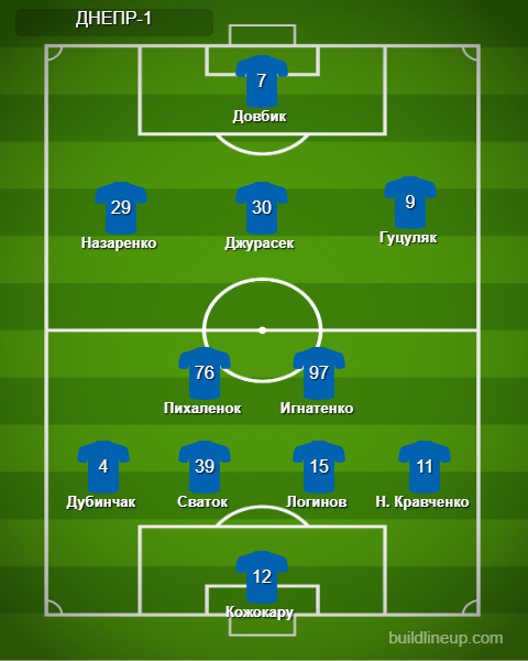 «Днепр-1»: Кожокару - Н. Кравченко, Логинов, Сваток, Дубинчак - Игнатенко, Пихаленок (Билл, 90+3) - Назаренко (Чуже, 73), Джурасек (ди Франко, 73), Гуцуляк (Ярмолюк, 85) - Довбик.