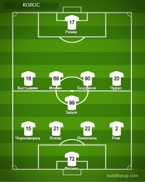 «Колос»: Фесюн - Ром, Павловец, Новак, Чорноморец (Гаврыш, 82) - Чурко, Задоя (Милько, 59), Богданов, Ильин (Диего, 82), Костышин (Велетень, 62) - Ренан (Лысенко, 46).