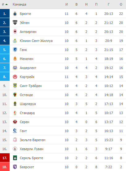 «Брюгге» стал лидером турнира, имея 22 очка после 11 матчей. Далее идут «Эйпен» и «Антверпен» (по 20 баллов после 10 игр)
