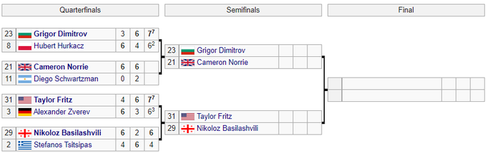 Соперником Фритца в полуфинале неожиданно будет Николоз Басилашвили из Грузии, который обыграл 2-го сеяного грека Стефаноса Циципаса в трех партиях.