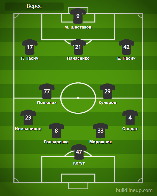 «Верес»: Когут – Немчанинов, Гончаренко, Мирошник, Солдат – Полюлях (Махнев, 88), Кучеров – Г. Пасич (Дахновский, 88), Панасенко (Петько, 71), Е. Пасич (Тимофеенко, 82) – М. Шестаков (Сергийчук, 71).