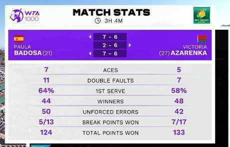 Виктория Азаренко (Беларусь) – Паула Бадоса Хиберт – 6:7 (5:7), 6:2, 6:7 (2:7)