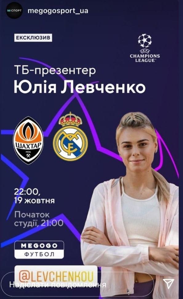 Известная украинская легкоатлетка Юлия Левченко будет ТВ-презентером матча Лиги чемпионов «Шахтер» - «Реал». Об этом сообщила сама спортсменка в своем Инстаграме: