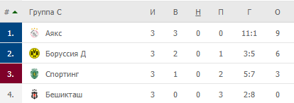 В матче лидеров группы C «Аякс» разгромил «Боруссию» Д со счетом 4:0. Теперь нидерландский клуб единолично возглавил турнирную таблицу (9 очков из 9).