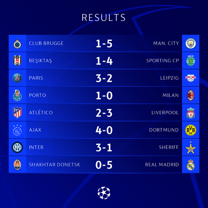 В группе D донецкий «Шахтер» потерпел сокрушительное фиаско в домашнем матче против мадридского «Реала» (0:5). Итальянский «Интер» сумел справиться с «Шерифом» под руководством Юрия Вернидуба (3:1).
