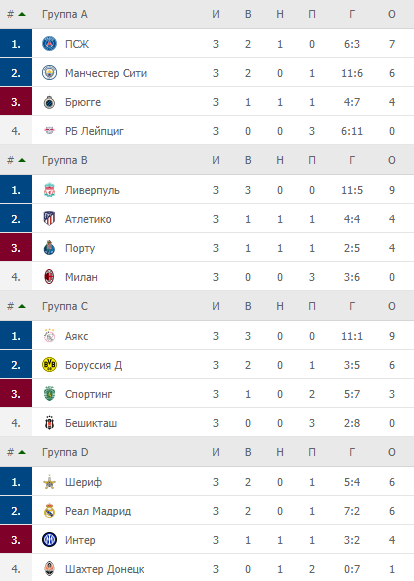 Лидерами группы являются «Шериф» и «Реал» (по 6 очков), дальше идет «Интер» (4 балла). А вот «Шахтер» замыкает турнирную таблицу, не забив пока что ни одного гола (1 пункт).