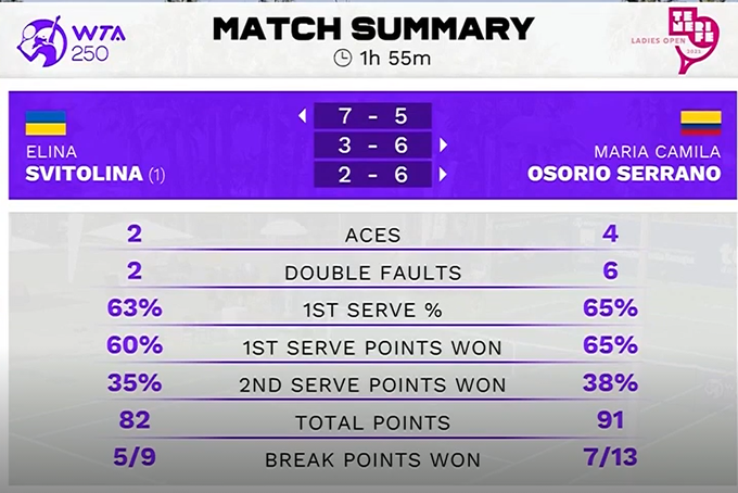 Украинка в среду не смогла довести до победы матч первого круга против Марии Камилы Осорио Серрано из Колумбии (№63 WTA), который во вторник был приостановлен после первого сета при счете 7:5 в пользу Свитолиной из-за наступления темноты.