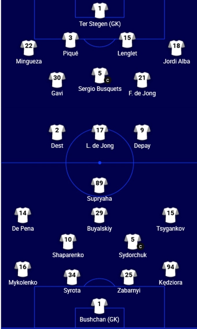Барселона: тер Штеген, Дест, Пике, Ленгле, Альба, Мингеса, Бускетс, Фрэнк де Йонг, Гави, Депай, Люк де Йонг
