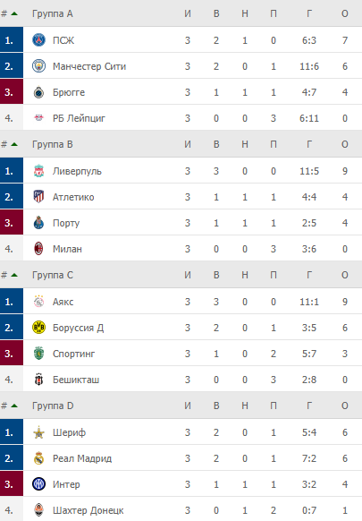 Турнирные таблицы ЛЧ. Динамо и Шахтер дружно в хвосте без забитых голов