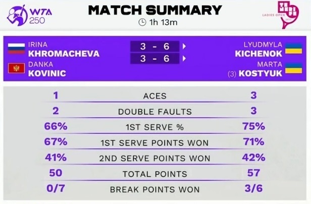 Отметим, что Людмила Киченок в текущем сезоне побеждала на турнире WTA в Ноттингеме в дуэте с Макото Ниномией из Японии. Лучшее достижение Костюк в паре – победа на 60-тысячнике в Каире в прошлом сезоне. На юниорском уровне Марта выигрывала парный US Open-2017 в дуэте с Ольгой Данилович.