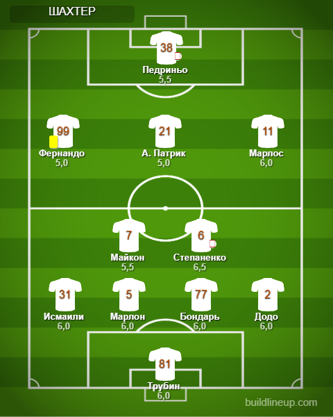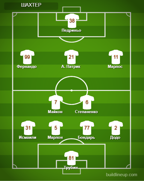 «Шахтер»: Трубин - Додо, Марлон, Бондарь, Исмаили (Конопля, 82) - Степаненко (Судаков, 56), Майкон - Марлос, А. Патрик (Сикан, 46), Фернандо (Соломон, 46) - Педриньо (Тете, 46).