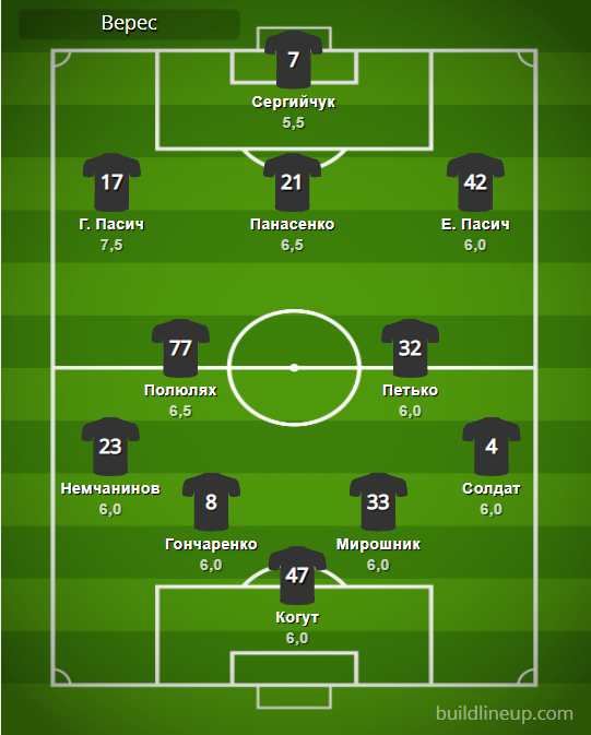 «Верес»: Когут – Немчанинов, Гончаренко, Мирошник, Солдат – Полюлях (Махнев, 88), Петько – Г. Пасич (Гечев, 88), Панасенко (Гегедош, 75), Е. Пасич (Дахновский, 42) – Сергийчук (М. Шестаков, 46).