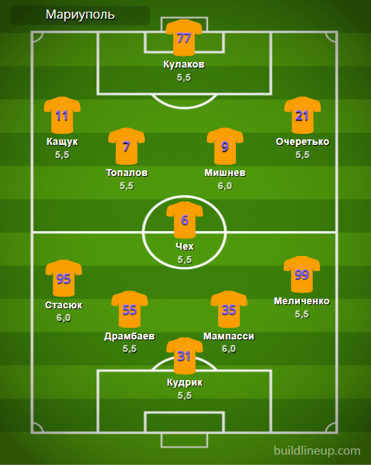 «Мариуполь»: Кудрик – Стасюк, Драмбаев, Мампасси, Меличенко – Чех – Кащук (Свитюха, 86), Топалов, Мишнев (Шостак, 86), Очеретько – Кулаков (Вьюнник, 67).