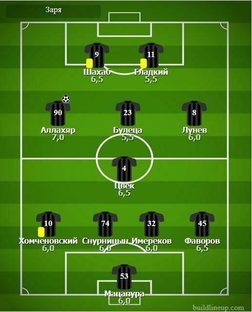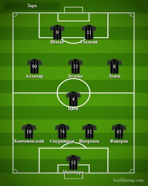 «Заря»: Мацапура, Фаворов, Имереков, Снурницын, Хомченовский, Цвек, Булеца, Лунев (Овусу, 88), Гладкий, Аллахяр, Шахаб (Кристиан, 73).