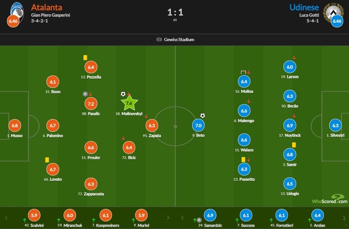 Украинец, который записал в свой актив единственный гол своей команды, получил оценку 7.56. Больше семи в составе бергамасков есть только у Марио Пашалича (7.17).