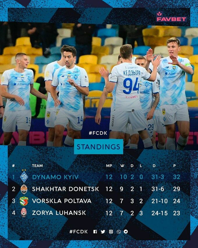 Турнирная таблица УПЛ. Между Динамо и Шахтером 3 очка, Заря атакует Ворсклу