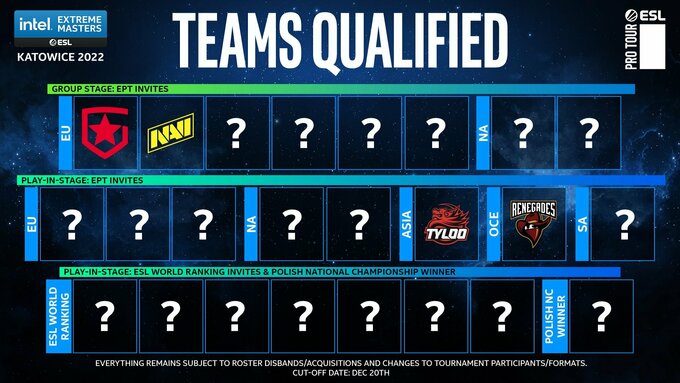 ESL сообщили, что уже есть несколько команд, которые набрали достаточно очков EPT для участия в IEM Katowice 2022. Gambit и NAVI получили приглашения в групповой этап, а TyLoo и Renegades в стадию плей-ин. 20 декабря будет известен полный список участников турнира по CS:GO.