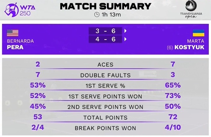 Марта Костюк (Украина) – Бернарда Пера (США) – 6:3, 6:4