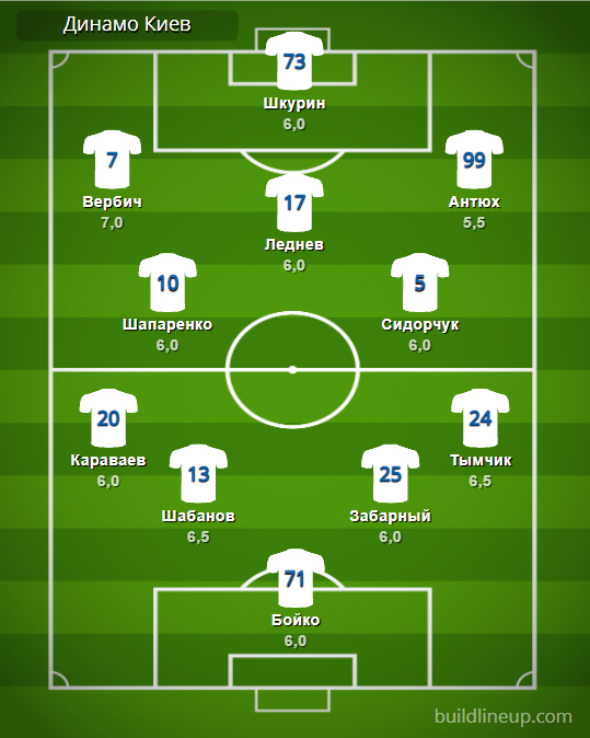 «Динамо» Киев: Бойко – Караваев, Шабанов, Забарный, Тымчик – Шапаренко (Шепелев, 46), Сидорчук (Кендзера, 77) – Вербич, Леднев (Гармаш, 68), Антюх (Витиньо, 68) – Шкурин (Рамирес, 46).