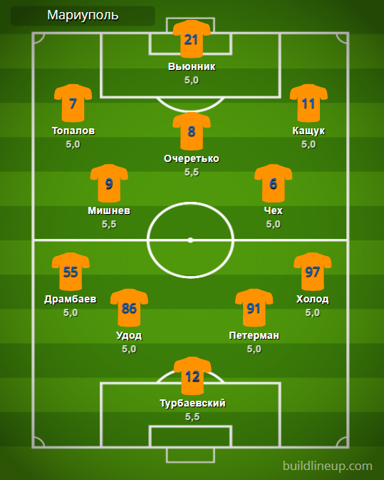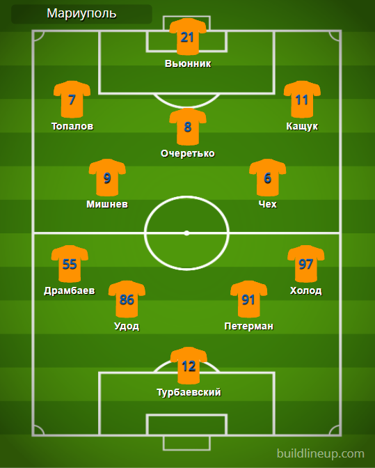 «Мариуполь»: Турбаевский – Драмбаев, Удод, Петерман, Холод (Стасюк, 46) – Мишнев, Чех (Спировски, 70) – Топалов (Шостак, 58), Очеретько, Кащук (Никитишин, 81) – Вьюнник (Меличенко, 81).