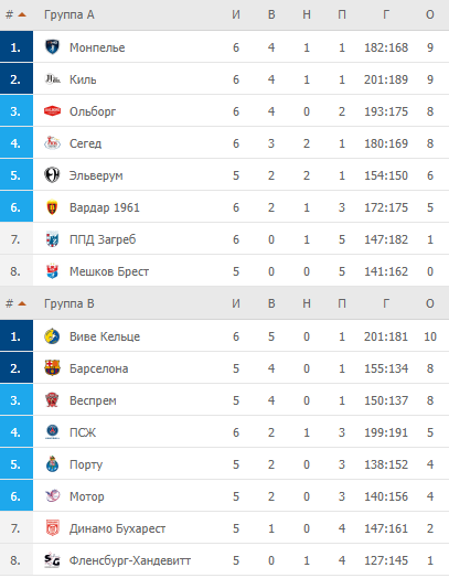 Лига чемпионов 2021/22 по гандболу. Турнирная таблица