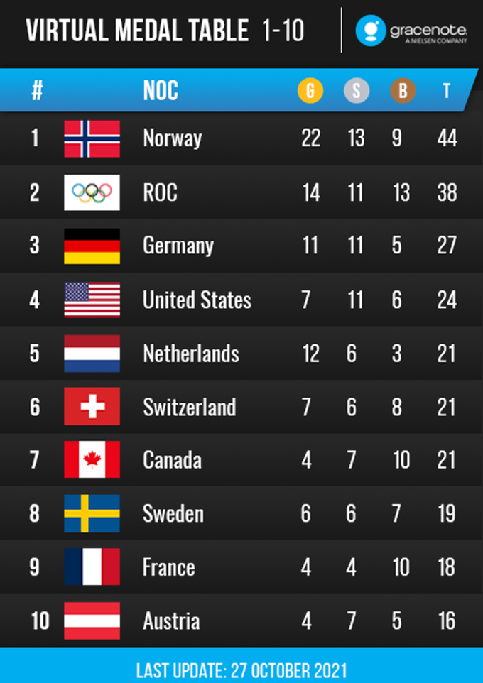 Аналитики Gracenote за 100 дней до старта зимних Олимпийских Игр в Пекине спрогнозировали итоговый медальный зачет.