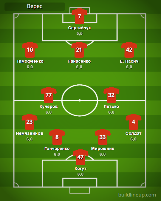 «Верес»: Когут – Немчанинов, Гончаренко, Мирошник, Солдат – Кучеров, Петько (Полюлях, 82) – Тимофеенко (Гечев, 82), Панасенко (Гегедош, 74), Е. Пасич – Сергийчук (М. Шестаков, 74).