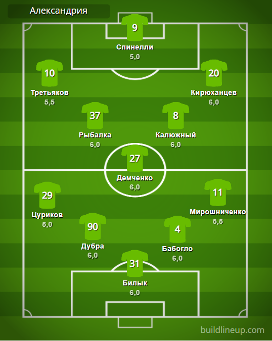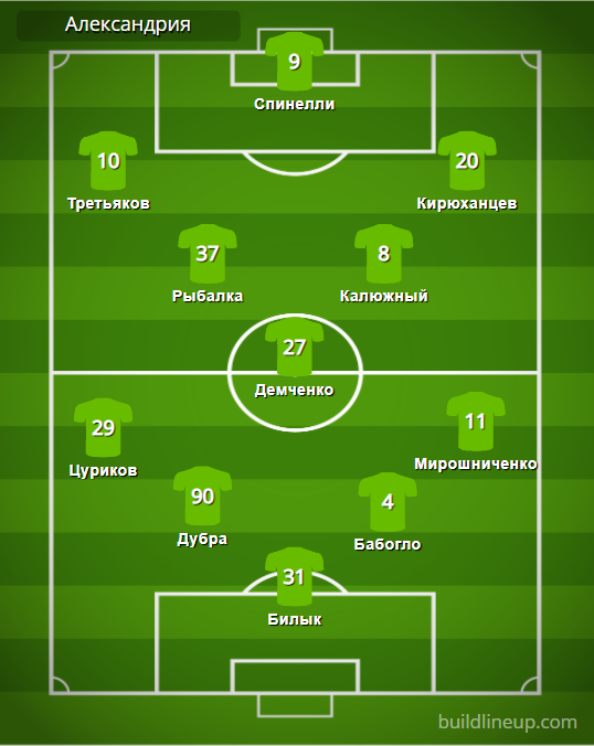 «Александрия»: Билык – Цуриков, Дубра, Бабогло, Мирошниченко – Рыбалка, Демченко (Мустафаев, 68), Калюжный – Третьяков, Спинелли (Устименко, 46), Кирюханцев (Кожушко, 68).