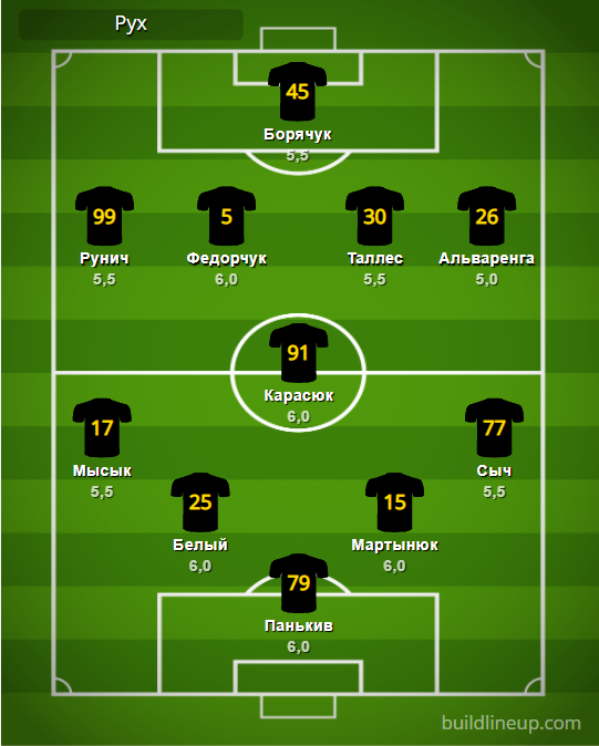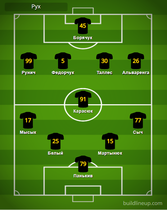 «Рух»: Панькив – Мысык, Белый, Мартынюк, Сыч – Карасюк – Рунич (Кузык, 58), Федорчук (Притула, 76), Таллес (Стаменкович, 86), Альваренга – Борячук (Кондраков, 58).