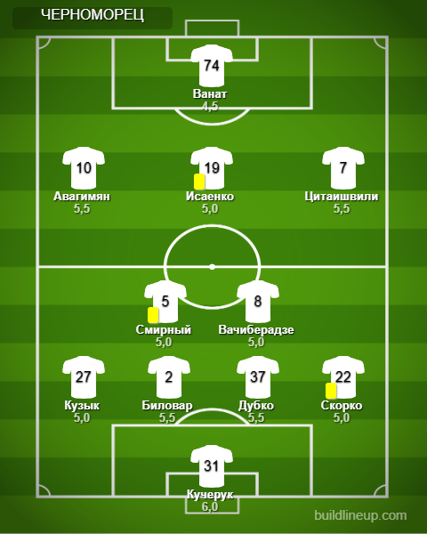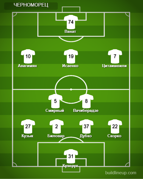 «Черноморец»: Кучерук - Скорко (Долгов, 62), Биловар, Дубко, Кузык - Вачиберадзе (С. Кравченко, 79), Смирный - Цитаишвили, Исаенко (Тлумак, 79), Авагимян (Брагару, 62) - Ванат (Бугай, 88).