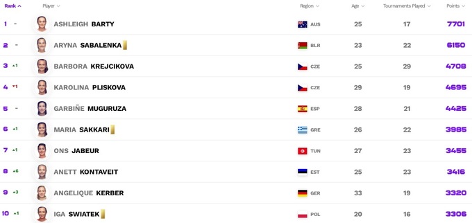 В Чемпионской гонке WTA определились все восемь участниц. Это Арина Соболенко, Барбора Крейчикова, Каролина Плишкова, Мария Саккари, Ига Свёнтек, Гарбинье Мугуруса, Паула Бадоса и Анетт Контавейт.