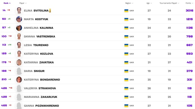 Украинки в рейтинге WTA