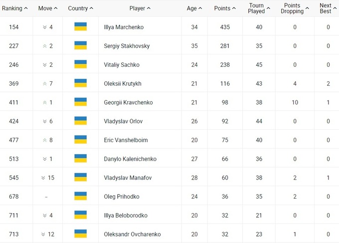 Что касается украинцев, то Илья Марченко потерял 4 позиции, а Сергей Стаховский поднялся на две строчки. Личные рекорд установили Алексей Крутых, Георгий Кравченко и Эрик Ваншельбойм.
