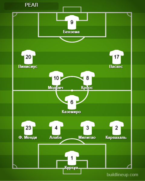«Реал»: Куртуа - Карвахаль (Начо, 66), Милитао, Алаба, Менди - Модрич, Каземиро, Кроос - Васкес, Бензема (Йович, 79), Винисиус.