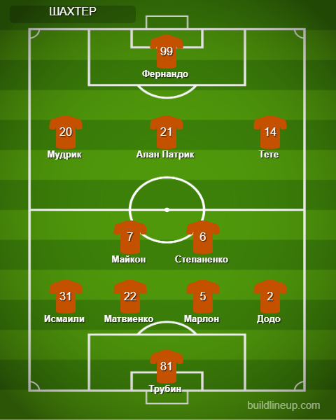 «Шахтер»: Трубин - Додо, Марлон, Матвиенко, Исмаили - Степаненко (Судаков, 79), Майкон - Тете (Марлос, 79), Алан Патрик (Маркос Антонио, 79), Мудрик (Соломон, 71) - Фернандо (Дентиньо, 86).