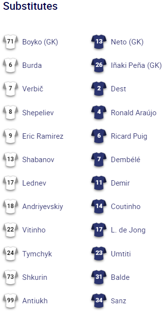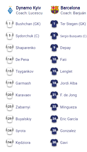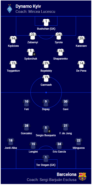 Барселона: Тер Штеген, Бускетс (к), Депай, Фати, Ленгле, Жорди Альба, Ф. де Йонг, Мингеса, Эрик Гарсия, Нико Гонсалес, Гави.