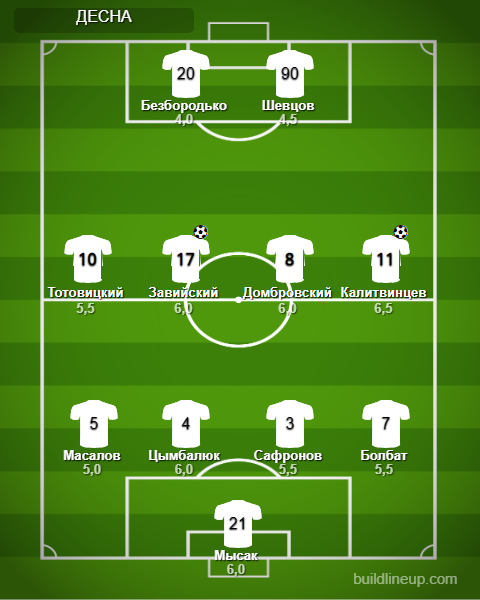 Замены «Десны»: Картушов - 5,5, Будкивский - 5,5, Арвеладзе - 5,5, Селин - б/о, Шевцов - б/о