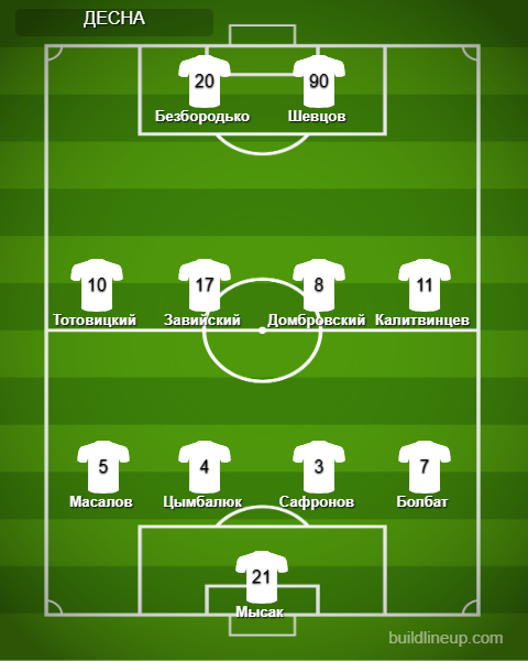 «Десна»: Мысак - Болбат, Сафронов, Цымбалюк, Масалов (Картушов, 46) - Калитвинцев (Дегтярев, 90+3), Домбровский, Завийский, Тотовицкий (Селин, 80) - Безбородько (Будкивский, 46), Шевцов (Арвеладзе, 62).