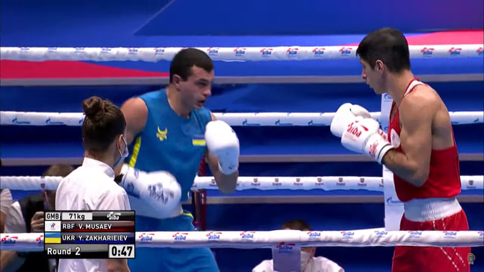 В финале ЧМ-2021 Захареев боксировал против 28-летнего Вадима Мусаева из России. Украинец вел поединок первым номером и доминировал на ринге, что отразилось на записках судей по итогам боя (5:0).
