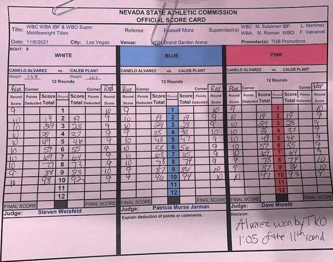 До остановки боя Альварес лидировал на карточках всех судей: 98-92, 96-94 и 97-93.