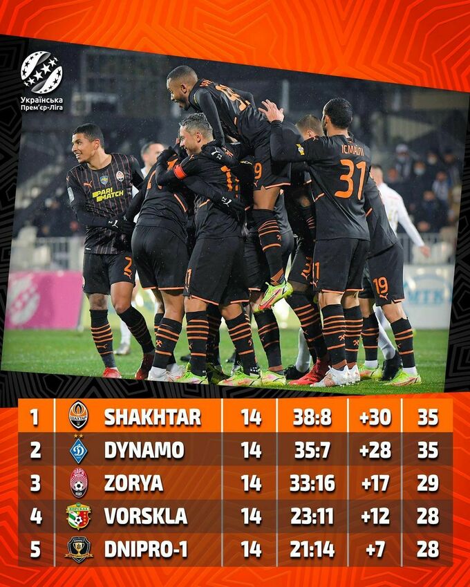 Выиграв у «Колоса» (3:1), по итогам 14-го тура «Шахтер» догнал «Динамо» (по 35 очков) и опередил киевлян по разнице мячей. Киевская команда потерпела сенсационное поражение от «Ворсклы» (1:2).