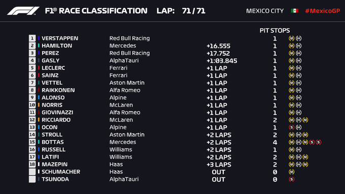 Макс уверенно победил и увеличил отрыв от Хэмилтона до 19 пунктов. Льюис финишировал 2-м, а Перес - 3-м. У Ред Булла были надежды, что Серхио в конце сможет прессинговать Хэмилтона, но мексиканец домашнюю гонку закончил позади британца.