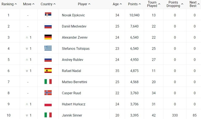 В первой десятке произошло несколько изменений. Александр Зверев подвинул Стефаноса Циципаса с третьей строчки, повторив личный рекорд. Рафаэль Надаль опустился уже на шестую позицию, пропустив вперед Андрея Рублева, который также повторил личное достижение. Поляк Хуберт Хуркач обошел Янника Синнера и стал девятым, так высоко он еще не подымался.