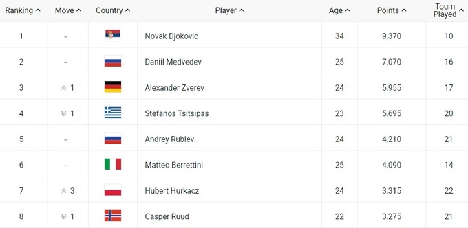 По результатам Чемпионской гонки определились все восемь участников Итогового турнира ATP. Это Новак Джокович, Даниил Медведев, Александр Зверев, Стефанос Циципас, Андрей Рублев, Маттео Берреттини, Хуберт Хуркач и Каспер Рууд.