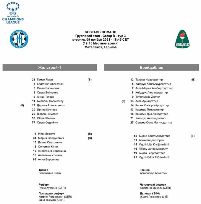 Обе команды ранее потерпели по два поражения в матчах с мадридским «Реалом» и ПСЖ. Харьковчанки дома уступили «галактикос» со счетом 0:1, а затем проиграли в Париже хозяйкам поля со счетом 0:5. Исландки в родных стенах проиграли парижанкам 0:2, а в Мадриде потерпели фиаско со счетом 0:5. «Брейдаблик» является первым исландским клубом, который добрался до группового этапа одного из турниров УЕФА. Отметим, что на данный момент «Жилстрой-1» и датский «Хэкен» нанесли меньше всего ударов в створ среди всех участников группового этапа - всего по одному.